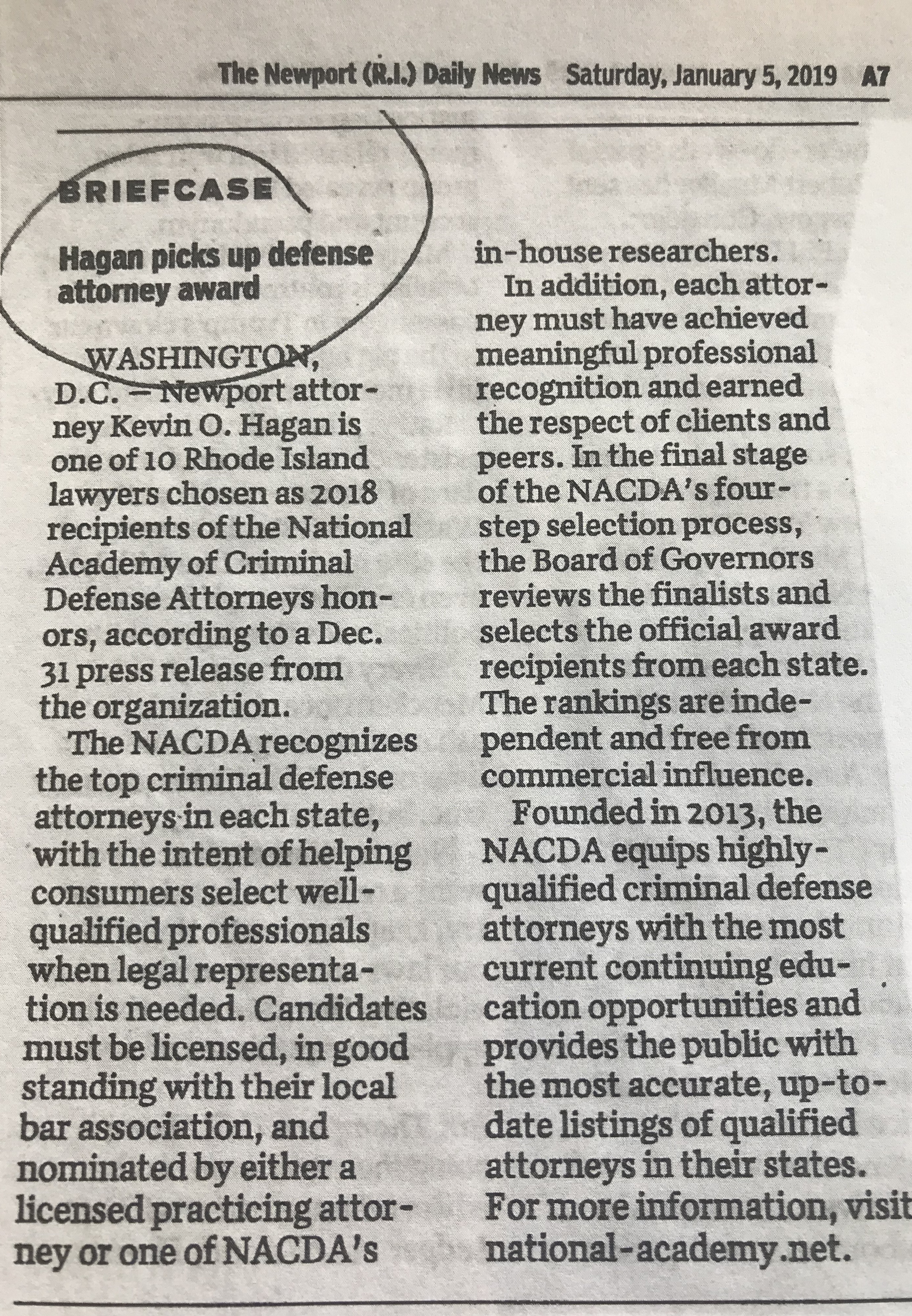 Kevin Hagan was recently honored as one of the top 10 criminal defense attorneys in Rhode Island.